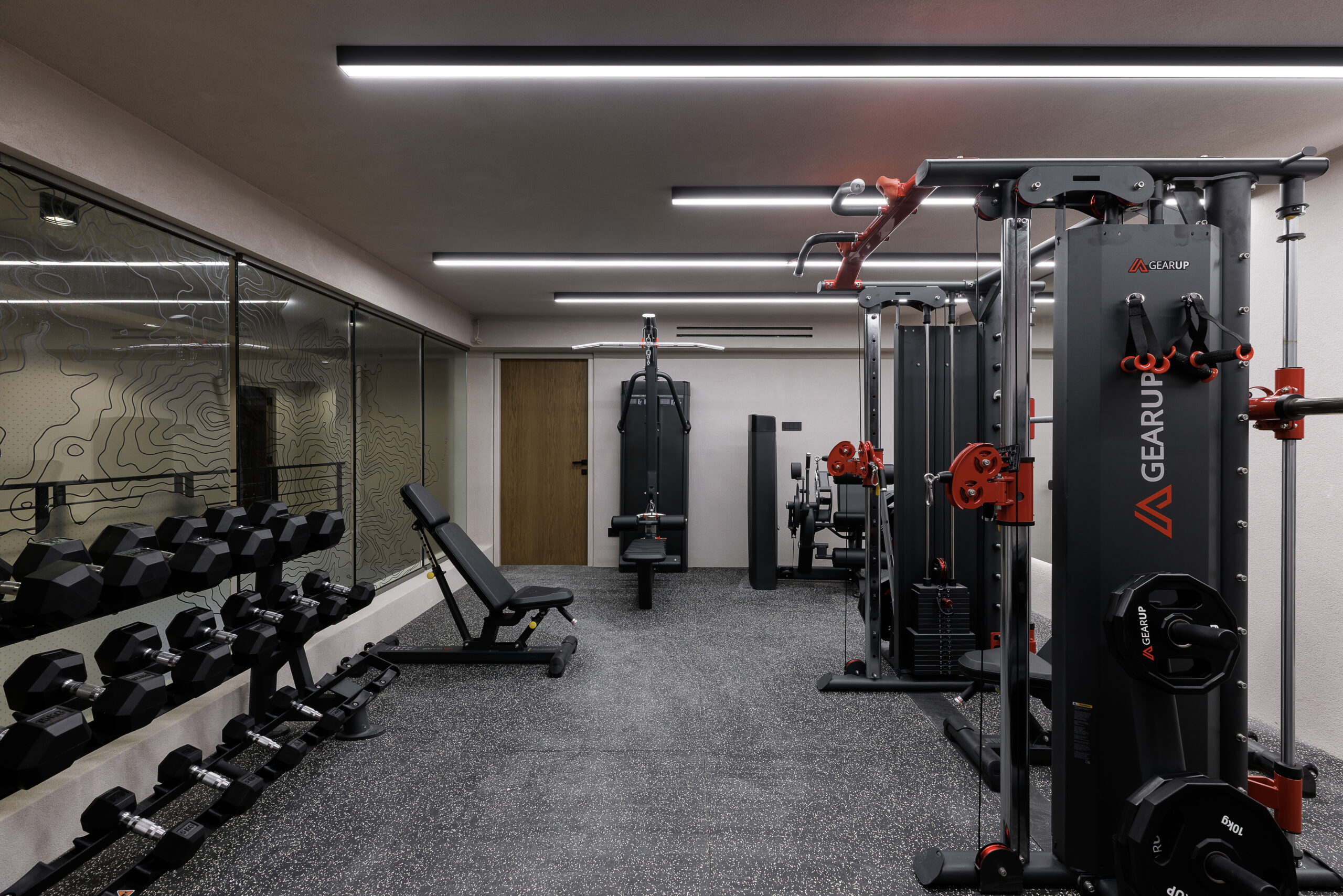 The middle level includes a fully equipped gym (31 sqm), adding a wellness dimension to the villa experience.
